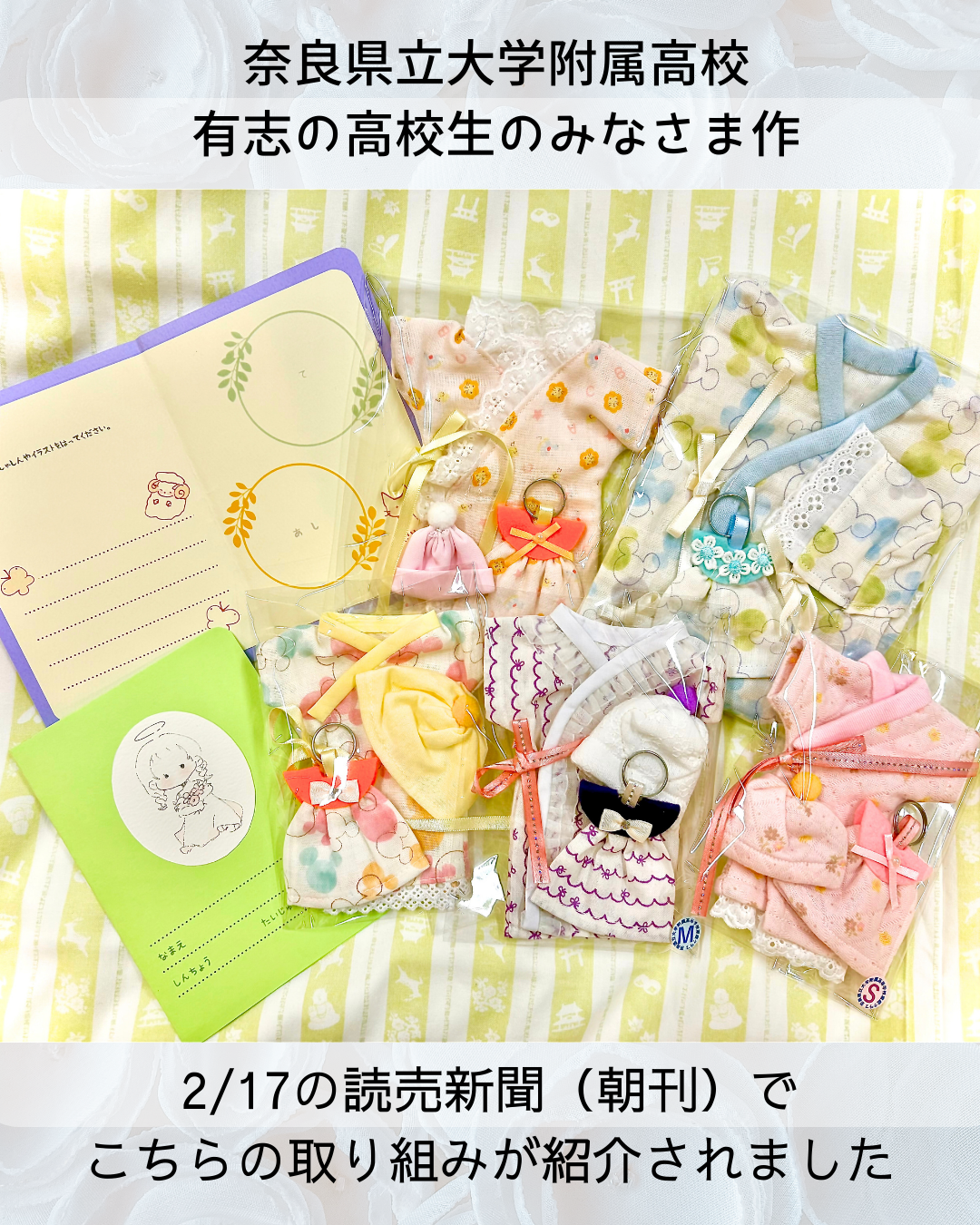 今回、奈良県立大学附属高校の有志の高校生たちが、着物とメッセージカード作りに協力してくださいました。